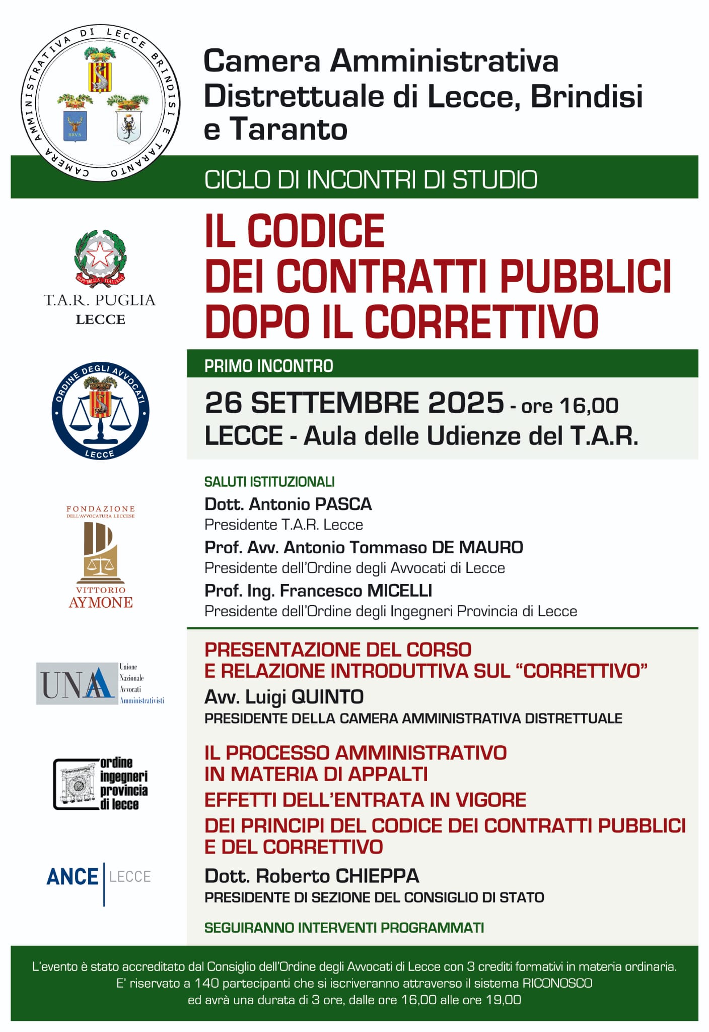 L'EVENTO E' ACCREDITATO DAL COA LECCE PER N. 3 CREDITI FORMATIVI IN MATERIA ORDINARIA, PER N. 140 AVVOCATI.