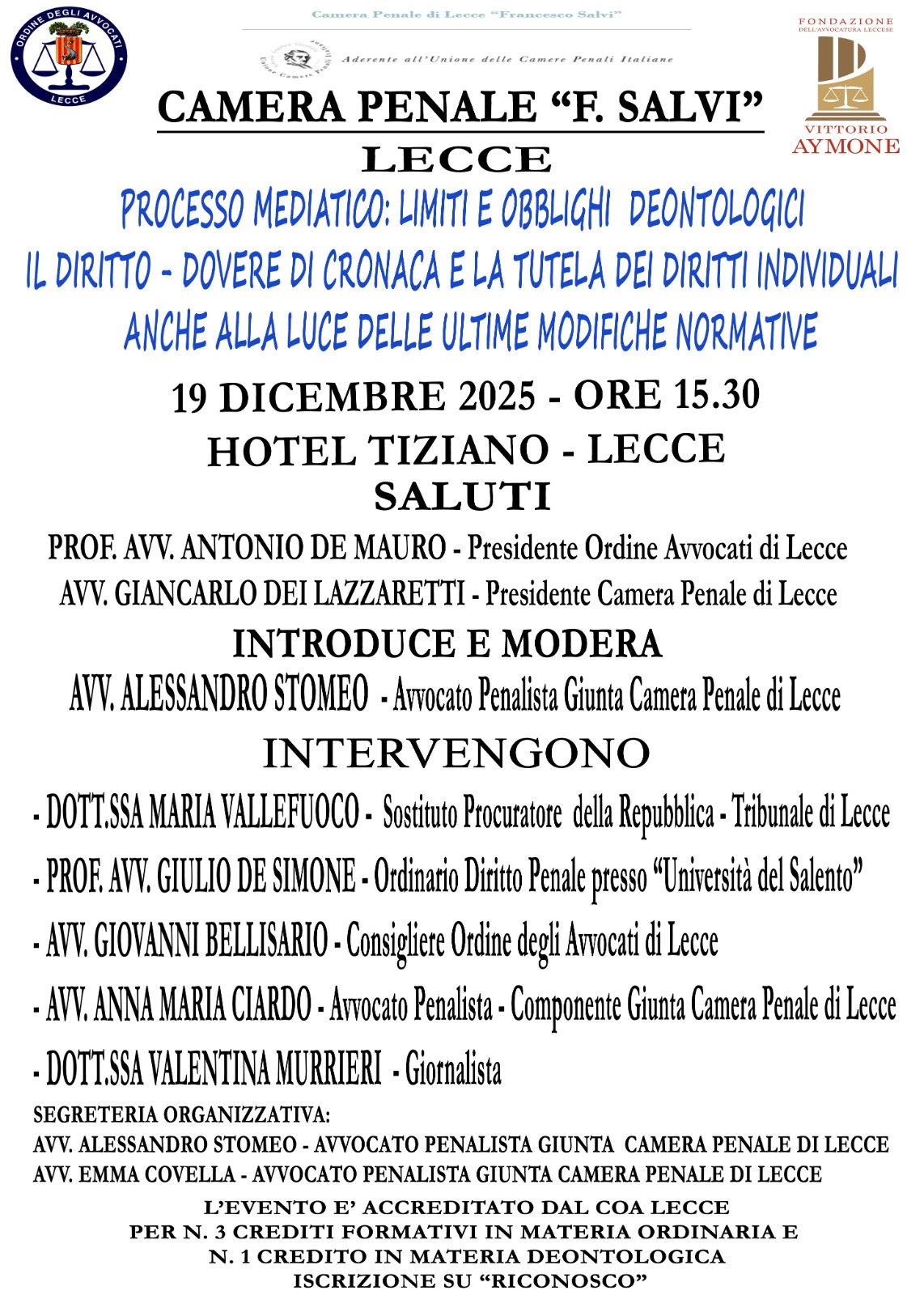 L'EVENTO E' ACCREDITATO DAL COA LECCE PER N. 3 CREDITI FORMATIVI IN MATERIA ORDINARIA E N. 1 CREDITO FORMATIVO IN MATERIA DEONTOLOGICA, PER N. 70 AVVOCATI. ISCRIZIONE SU RICONOSCO. L'attribuzione dei crediti sarà effettuata solo ai registrati su Riconosco che vidimeranno SOLO IL PROPRIO TESSERINO in ingresso ed in uscita e che parteciperanno IN SALA per TUTTA LA DURATA DELL'EVENTO FORMATIVO (REALE INIZIO E REALE FINE DELL'EVENTO)e che vidimeranno l'uscita. La priorità per l'accesso in sala sarà per gli iscritti su Riconosco. NON CI SARA' REGISTRO CARTACEO