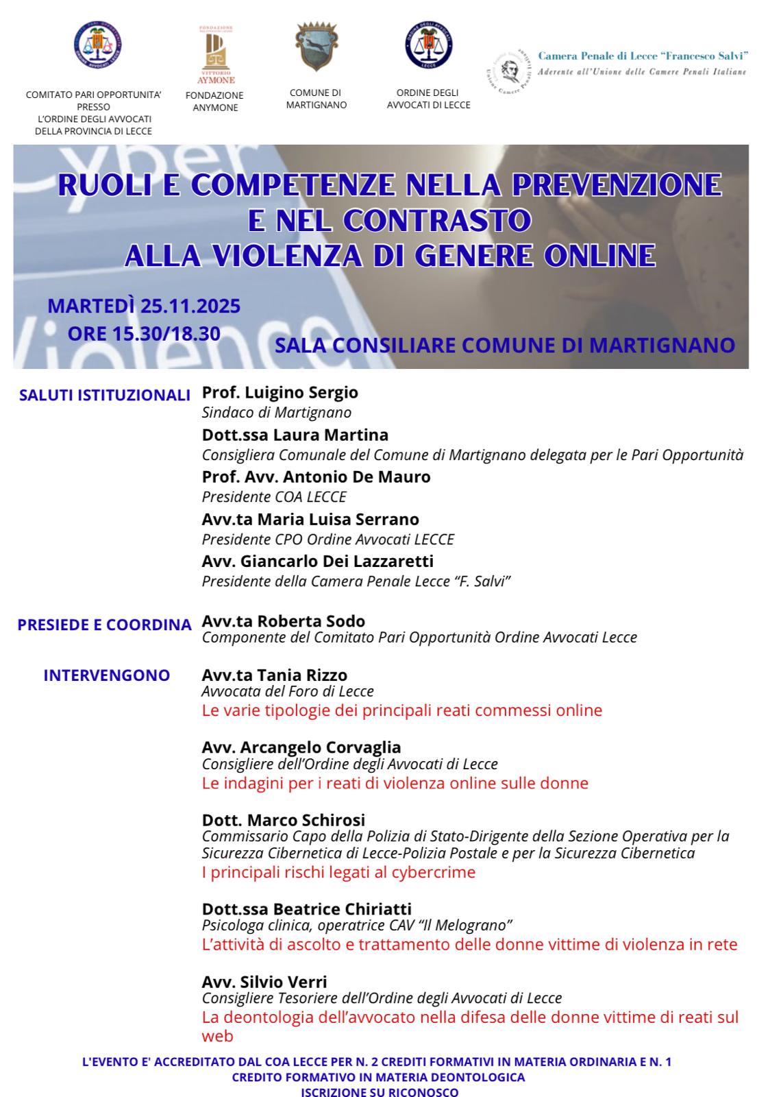 L'EVENTO E' ACCREDITATO DAL COA LECCE PER N. 2 CREDITI FORMATIVI IN MATERIA ORDINARIA E N. 1 CREDITO FORMATIVO IN MATERIA DEONTOLOGICA, PER N. 60 AVVOCATI. ISCRIZIONE SU RICONOSCO.