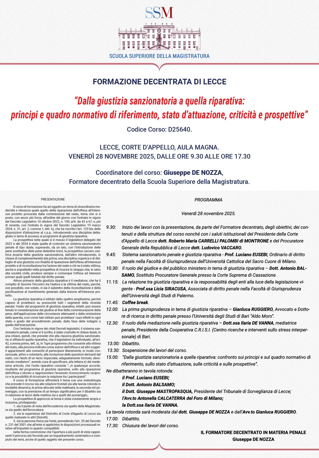 L'EVENTO E' ACCREDITATO DAL COA LECCE PER N. 3 CREDITI FORMATIVI IN MATERIA ORDINARIA PER LA SESSIONE MATTUTINA E N. 3 CREDITI ORDINARI PER LA SESSIONE POMERIDIANA, PER N. 50 AVVOCATI. ISCRIZIONE SU RICONOSCO.