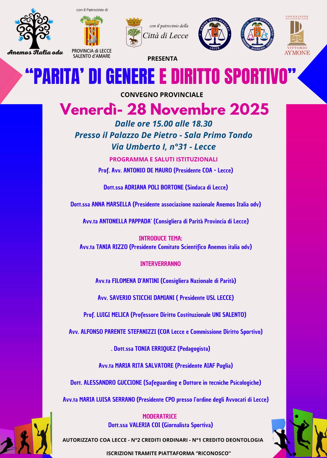 L'EVENTO E' ACCREDITATO DAL COA LECCE PER N. 2 CREDITI FORMATIVI IN MATERIA ORDINARIA E N. 1 CREDITO FORMATIVO IN MATERIA DEONTOLOGICA, PER N. 95 AVVOCATI.