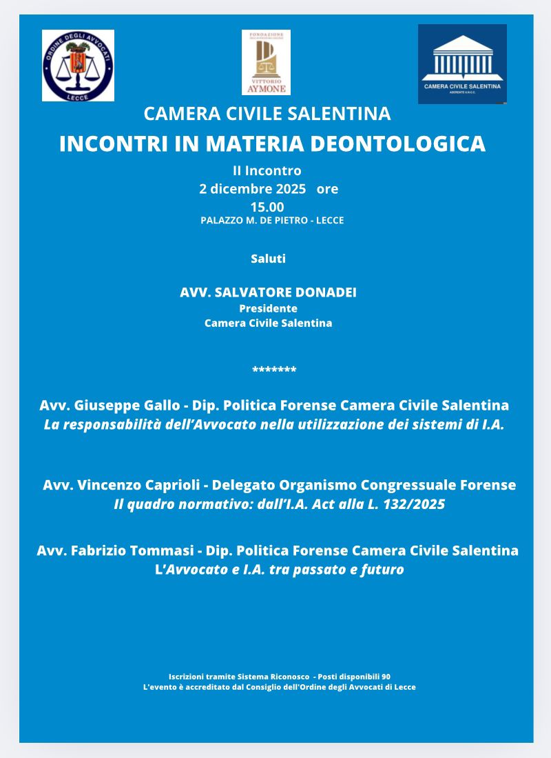 L'EVENTO E' ACCREDITATO DAL COA LECCE PER N. 2 CREDITI FORMATIVI IN MATERIA DEONTOLOGICA, PER N. 95 AVVOCATI. ISCRIZIONE SU RICONOSCO.