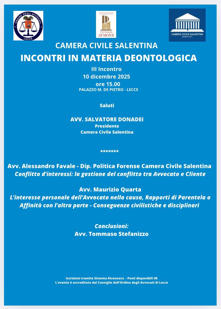 L'EVENTO E' ACCREDITATO DAL COA LECCE PER N. 2 CREDITI FORMATIVI IN MATERIA DEONTOLOGICA, PER N. 95 AVVOCATI. ISCRIZIONE SU RICONOSCO. L'attribuzione dei crediti sarà effettuata solo AGLI ISCRITTI SU RICONOSCO che parteciperanno IN SALA per TUTTA LA DURATA DELL'EVENTO FORMATIVO (inizio reale e fine reale dell'evento). IL TESSERINO E' STRETTAMENTE PERSONALE. IN INGRESSO VIDIMARE IL TESSERINO SOLO PRIMA DI ACCOMODARSI IN SALA PER PARTECIPARE ALL'EVENTO FORMATIVO, IN CASO DI ALLONTANAMENTO DALLA SALA SI RICORDA DI VIDIMARE SEMPRE L'USCITA. NON VI SARA' REGISTRO CARTACEO PER LE FIRME. L'accesso in sala sarà solo per gli iscritti su Riconosco.