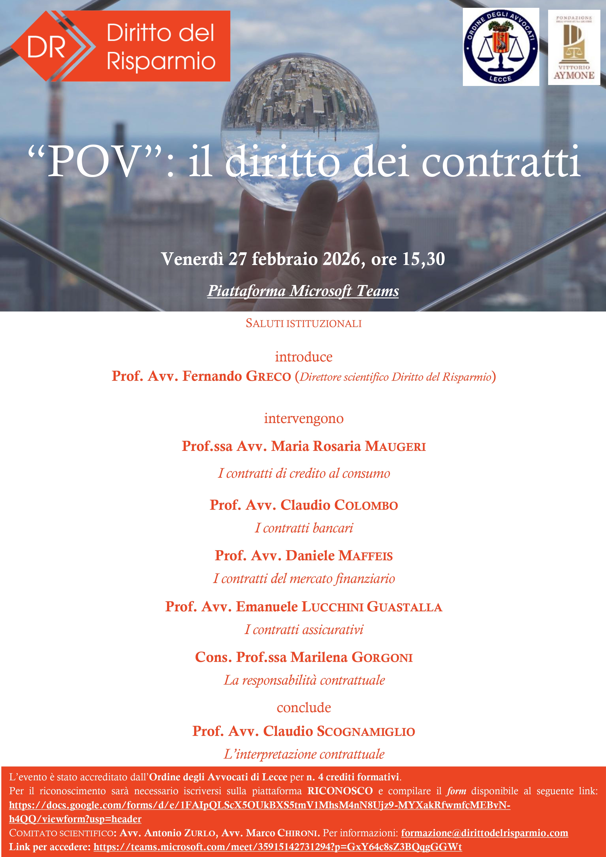 Prenotazioni SOLO tramite il link TEAMS inserito in calce alla locandina del programma - E' indispensabile inviare al momento della prenotazione all'evento l' esatto nominativo dell'avvocato e il codice fiscale, per l'attribuzione dei 4 crediti formativi accreditati al webinar.